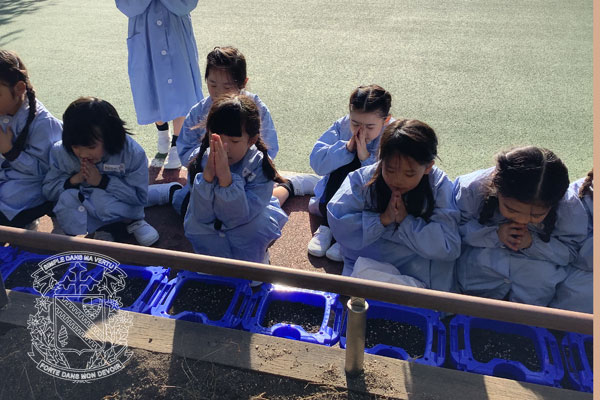 新学期最初の宗教の授業で、2年生から6年生はクラスごとに中学・高等学校の聖堂を訪問しました。新しい環境となり慌ただしい日が続く中、心を落ち着けて自分を振り返り、静かに祈りを捧げました。
